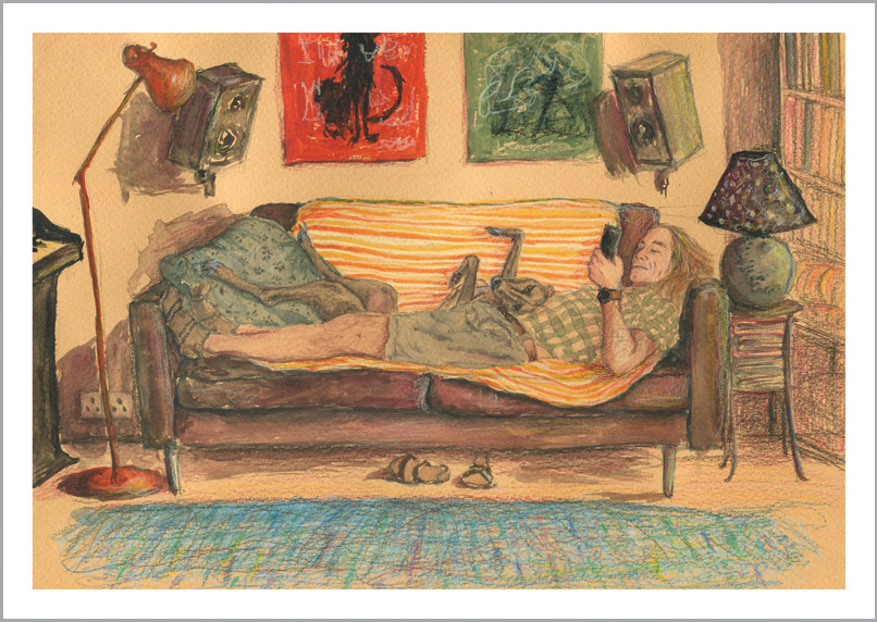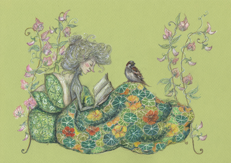 A Book and a Sparrow. The second drawing in my Magic Garden series. A lady reads in bed, under a quilt of nasturtium with bedposts of sweepea and sheets and pillows of bedstraw.