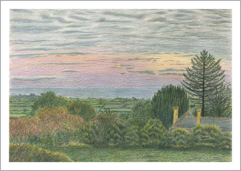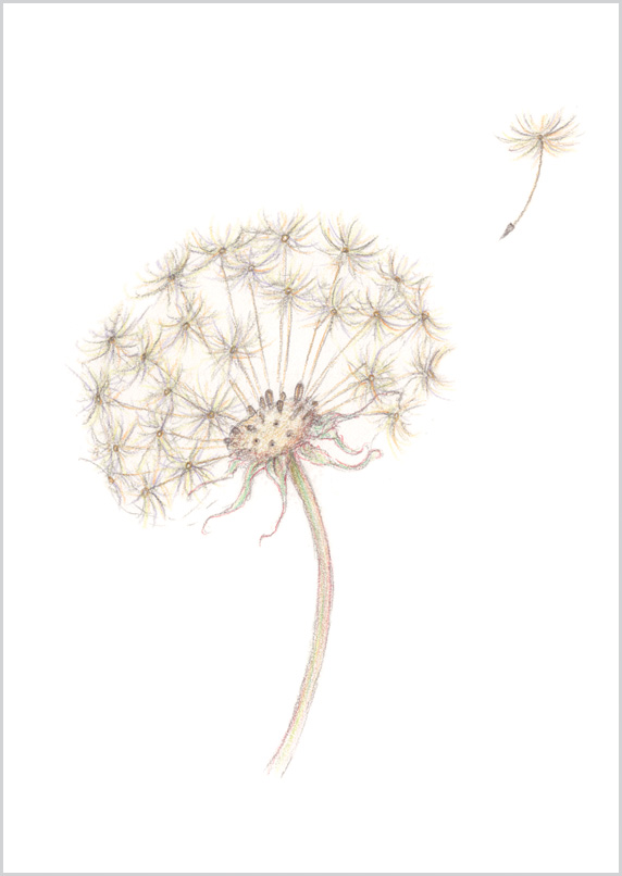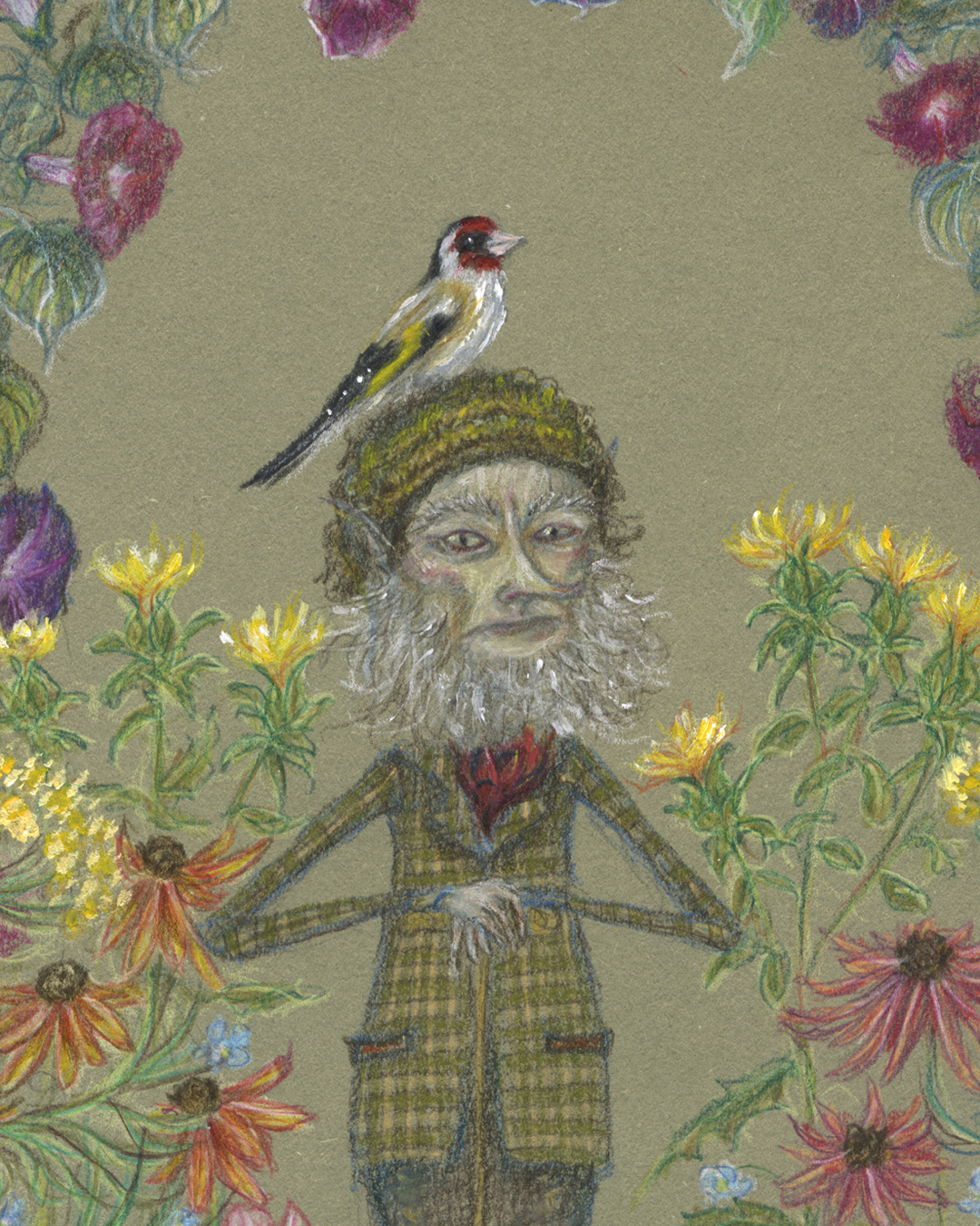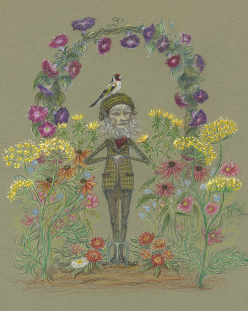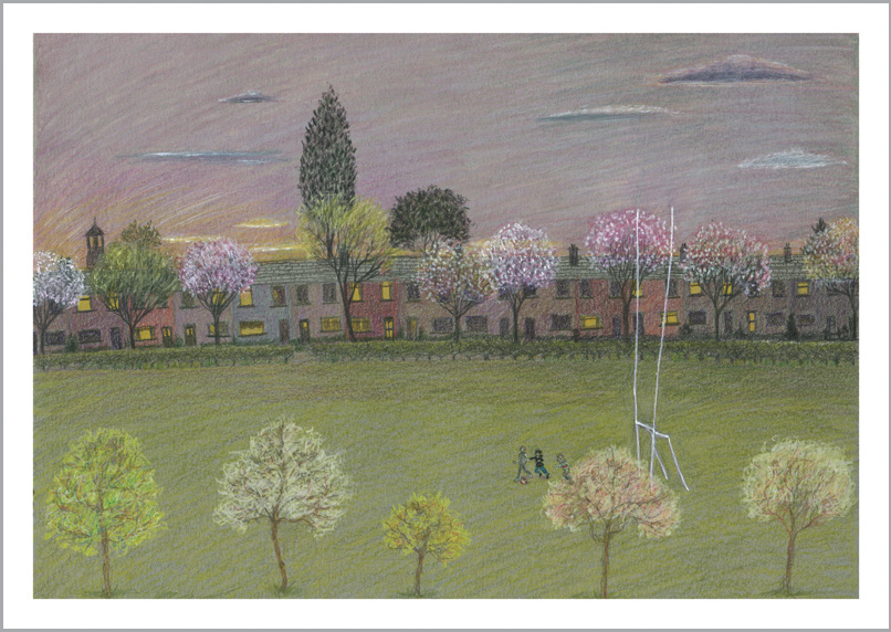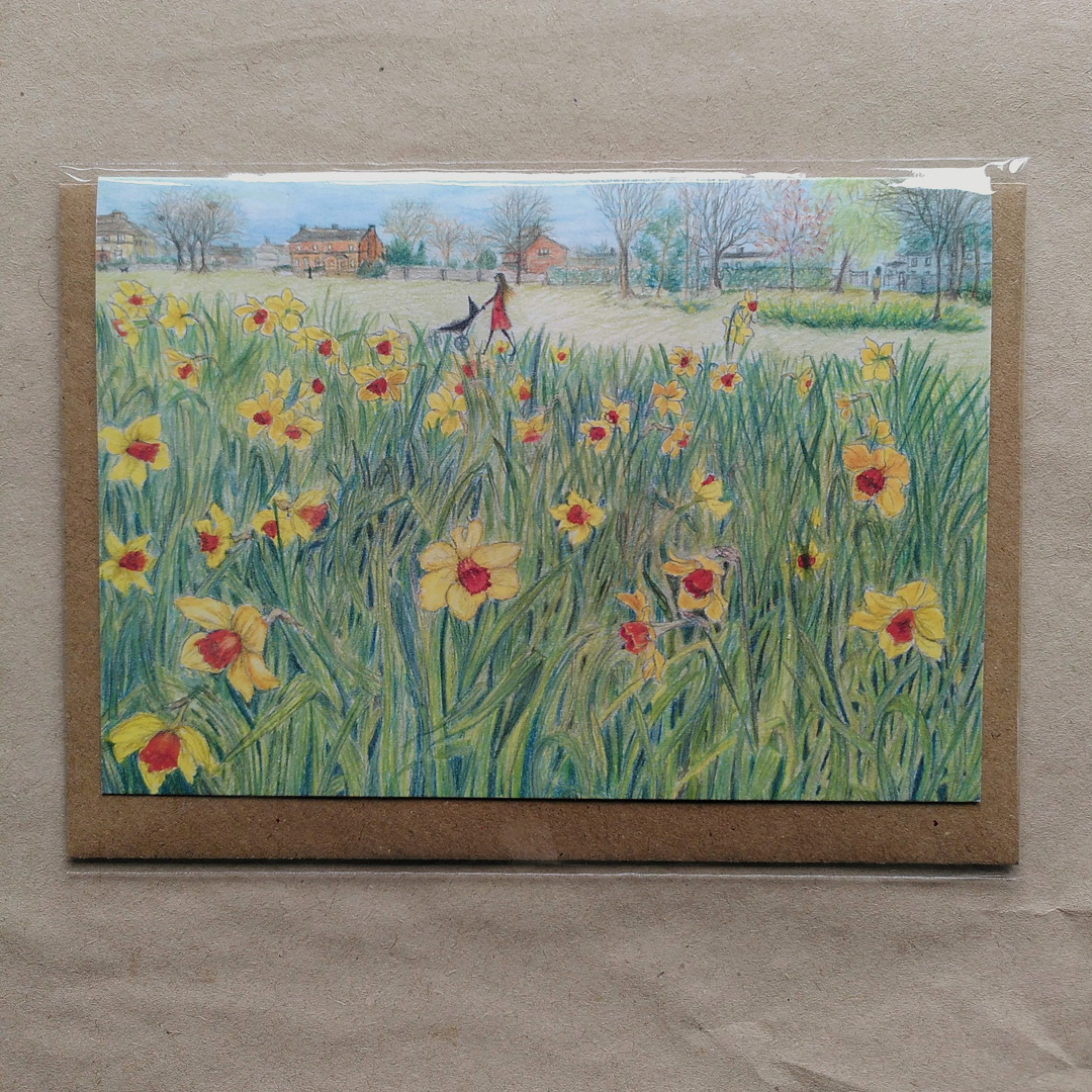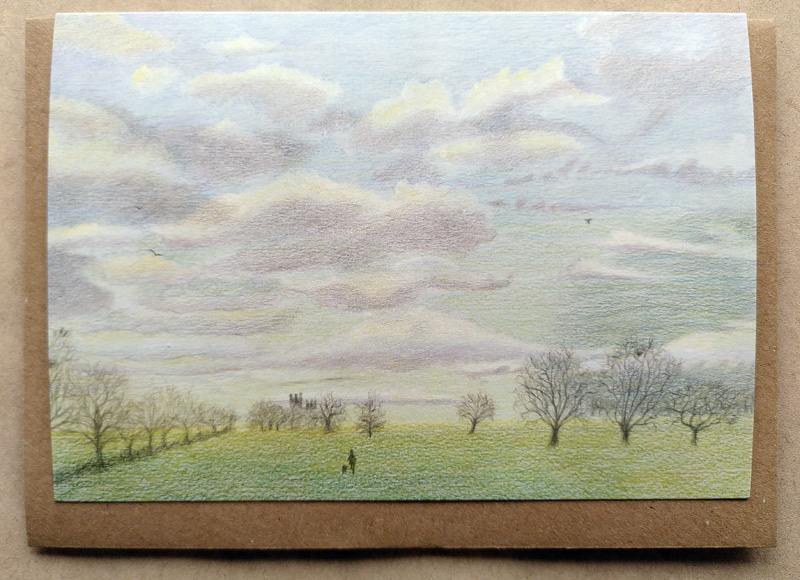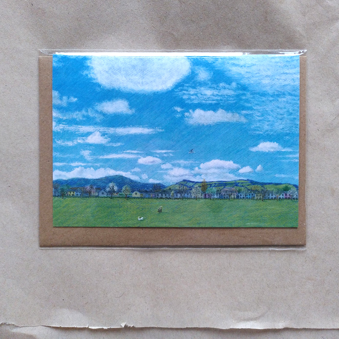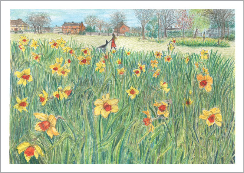 Gardener and Goldfinch. A small disgruntled gnome stands with a goldfinch perched on his hat. Around him bloom morning glory, safflower, fennel, rudbeckia, cosmos, flax and strawflower. This is a new drawing and not yet available as a card but if you are a stockist and would like to stock it as a card or as an A4 print do please let me know.A park filled with daffodils. It's coming up to St Patrick's Day and of course the plant most associated with this is the shamrock but the daffodil is definitely more conspicuous in Irish parks and streets. I based this on a park I live near in Dublin but I think it could be many places.A sunny park in Spring. A huge blue sky filled with white clouds, above the Wicklow Mountains. A row of terraced houses and trees in Spring blossom, and in the foreground, a woman walks towards her little white dog. Above them a seagull flies. I was really happy with this drawing (it's mostly colouring pencil, with some white acrylic) because it's celebrating the ordinary and everyday.