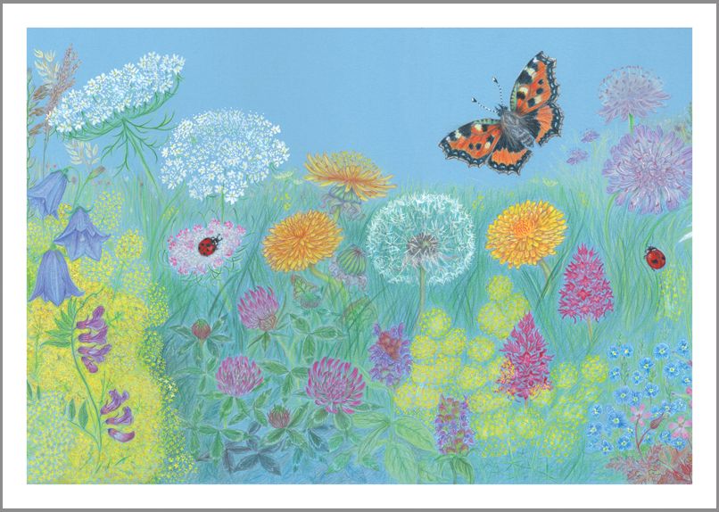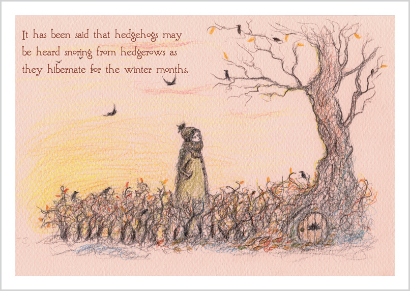 The snores of hedgehogs. This line is taken from The Living Countryside, a 1980s wildlife magazine, issues of which were always scattered around my home growing up.A little drawing I did last year and which features on the 2023 Klee Wallplanner for the days surrounding Christmas.November 2023 Winter hillOctober 2023 A pumpkin carriageSeptember 2023 Meadow. A Tortoiseshell Butterfly flies over a summer meadow with Harebell, bright gold Lady's Bedstraw, Bush Vetch, Queen Anne's Lace, Red Clover, Dandelion, Self-Heal, Pyramidal Orchid, Field Scabious, Germander Speedwell and Herb Robert. I based this meadow on a hill in Tymon Park in Dublin.