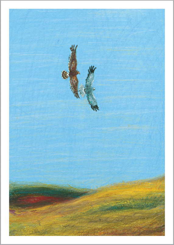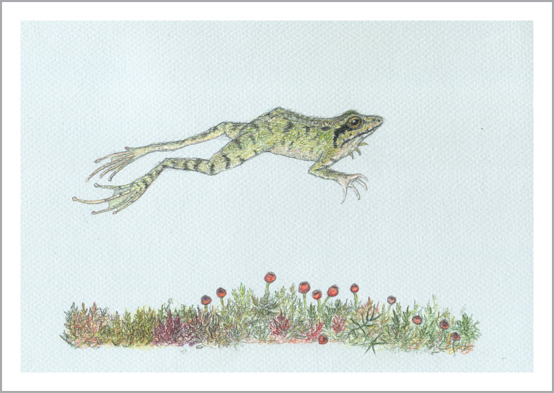 According to Irish Peatland Conservation, frogs have woken up and are having romantic rendez-vous! So it's a good time to show my wetlands range. From top left in vertical rows: Hen Harriers; Marsh Fritillary; Sundew; Summer Pond; Frogbit; Dragonfly Pond; Leaping Frog; Heron; Bog Asphodel; Irish Hare.