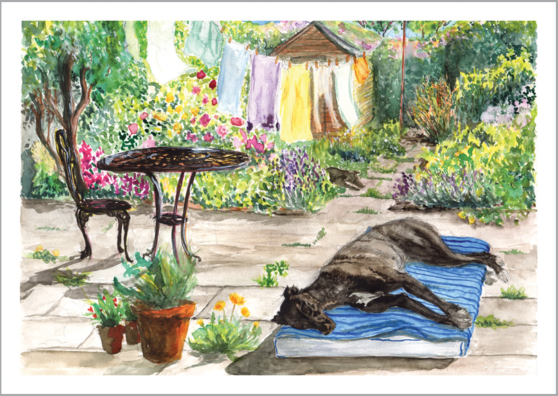 One of our two pet greyhounds basking in the sun. Our other greyhound is poking her snout out from the grass further down the garden.