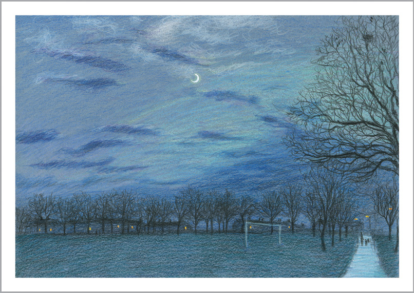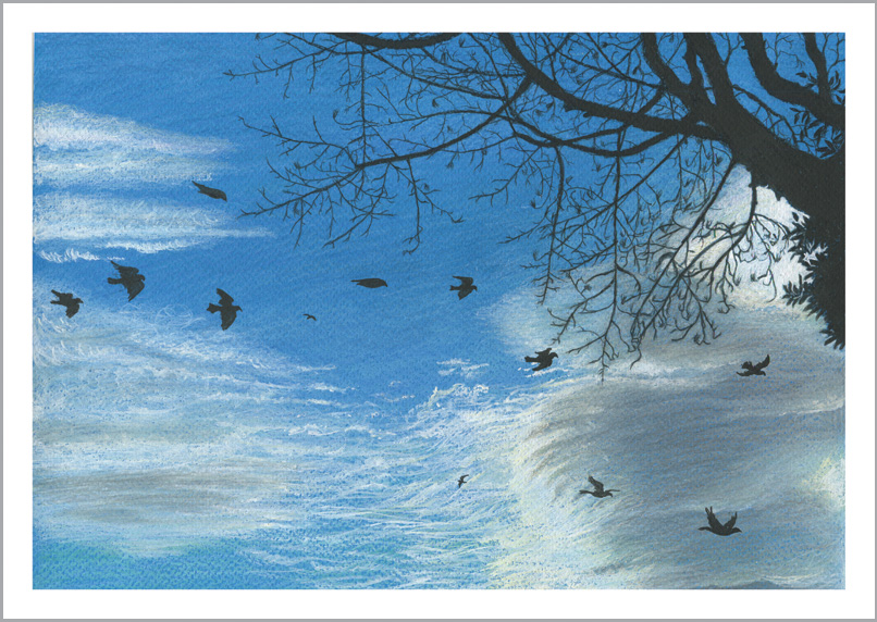 I based this on a photo I took of my husband and one of our dogs, last summer. Greyhounds are very affectionate and this one likes nothing better than to lie beside you on the sofa.Daffodil Park. I based this on a park in Crumlin which has large daffodil beds in Spring. Moonlit Park. I based this on another part of the same Crumlin park. In winter the lights from surrounding houses and the street peek through the bare trees.Pigeons Flying. One of my favourite things is to watch a flock of pigeons, glittering white and grey against the sky, shining like a shoal of fish. I haven't managed to paint them like that yet, but here they are silhouetted against a bright early Spring sky.