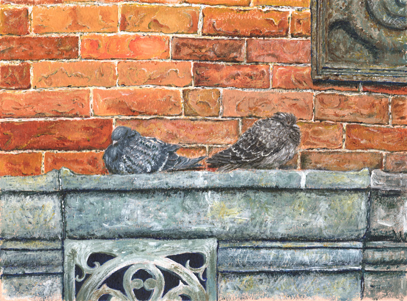 Pigeons at Platform 7, Connolly Station. During my holidays I did the excellent historical tour of Newbridge House in Donabate, North Dublin. Waiting to catch the train to Donabate at Connolly Station I saw two pigeons resting on a ledge on the opposite building. I took some liberties with the architecture, bringing together features that are more scattered. This was painted in acrylic on paper.
