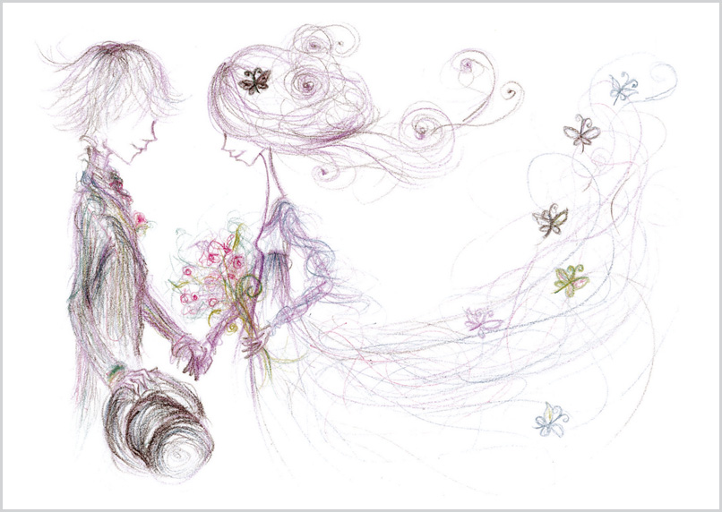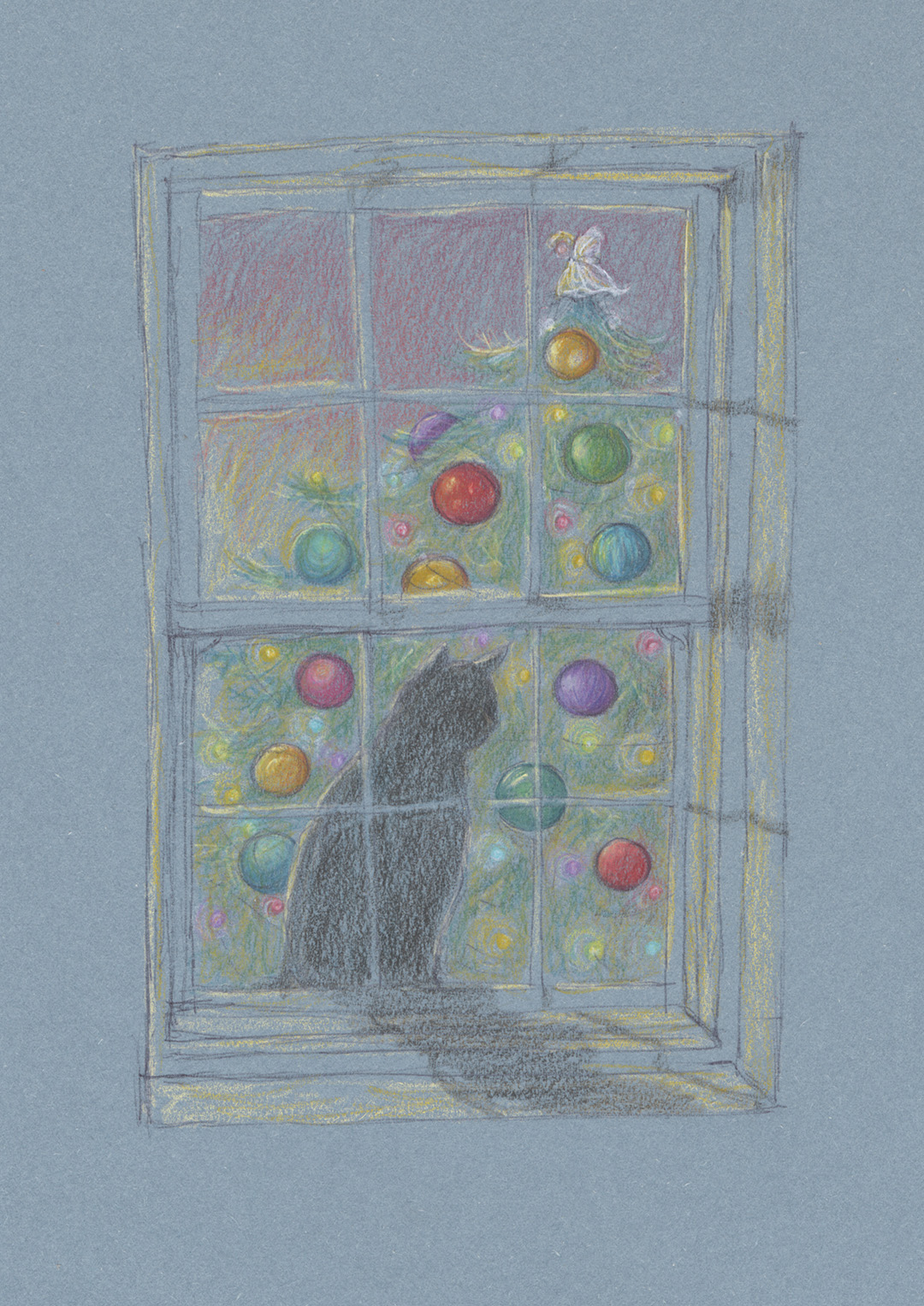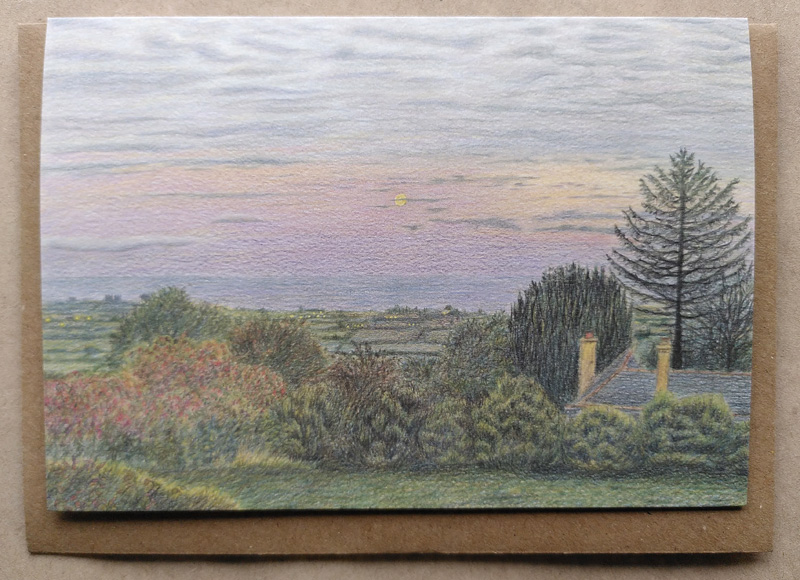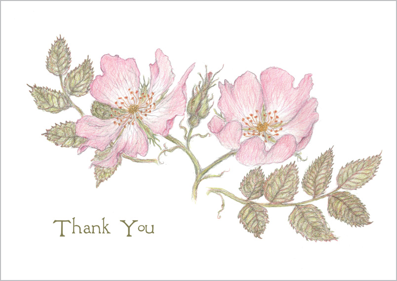Chrysanthemums. I did this drawing in Autumn 2022, but I stopped at the flowers and vase, with just a few lines for the surface, the shadow, and the green light from the glass. It was drawn on grey paper and I quite liked the contrast of the colourful chrysanthemums against the grey. But over the past few months it started niggling at me that it needed a brighter background. I finally attacked it with some lemon and ochre pencils, and I have to say I'm really pleased with this new version of it.It's a beautiful hot August day so I'm working on... Christmas cards! I do corporate Christmas cards for businesses who want to send something very special and memorable to their clients or customers in December. These can be from a very extensive range of existing designs, or I can draw something just for your company. The cards are printed in high quality on 100% recycled heavyweight paper.And a little more seasonably... a drawing of wild roses. I printed this up for a wedding couple, as thank-you cards with a personalised message inside, using recycled card which has a subtle tint of ivory and pairing them with envelopes in soft pink. This design is available with or without the 'Thank You' caption.