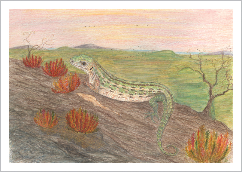 August 2023 Viviparous Lizard, or Common Lizard. The only reptile native to Ireland, these lizards are to be found in many habitats, from gardens to peat bogs. They are tiny, about the thickness of a pencil. As with other tiny creatures, looking closely at them draws us into another world, where moss forms bushes and twigs become small trees. A fragment of fallen bark is a craggy outcrop, and on it the little lizard has become a dragon, surveying its kingdom with a genial face.
