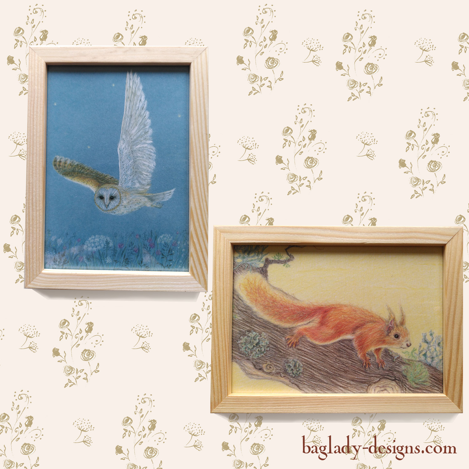 A pair of my Irish wildlife greetings cards in simple A6 frames in blonde wood. Barn Owl and Red Squirrel make a nicely contrasting couple of pictures for the wall. This makes an inexpensive but tasteful and thoughtful gift.