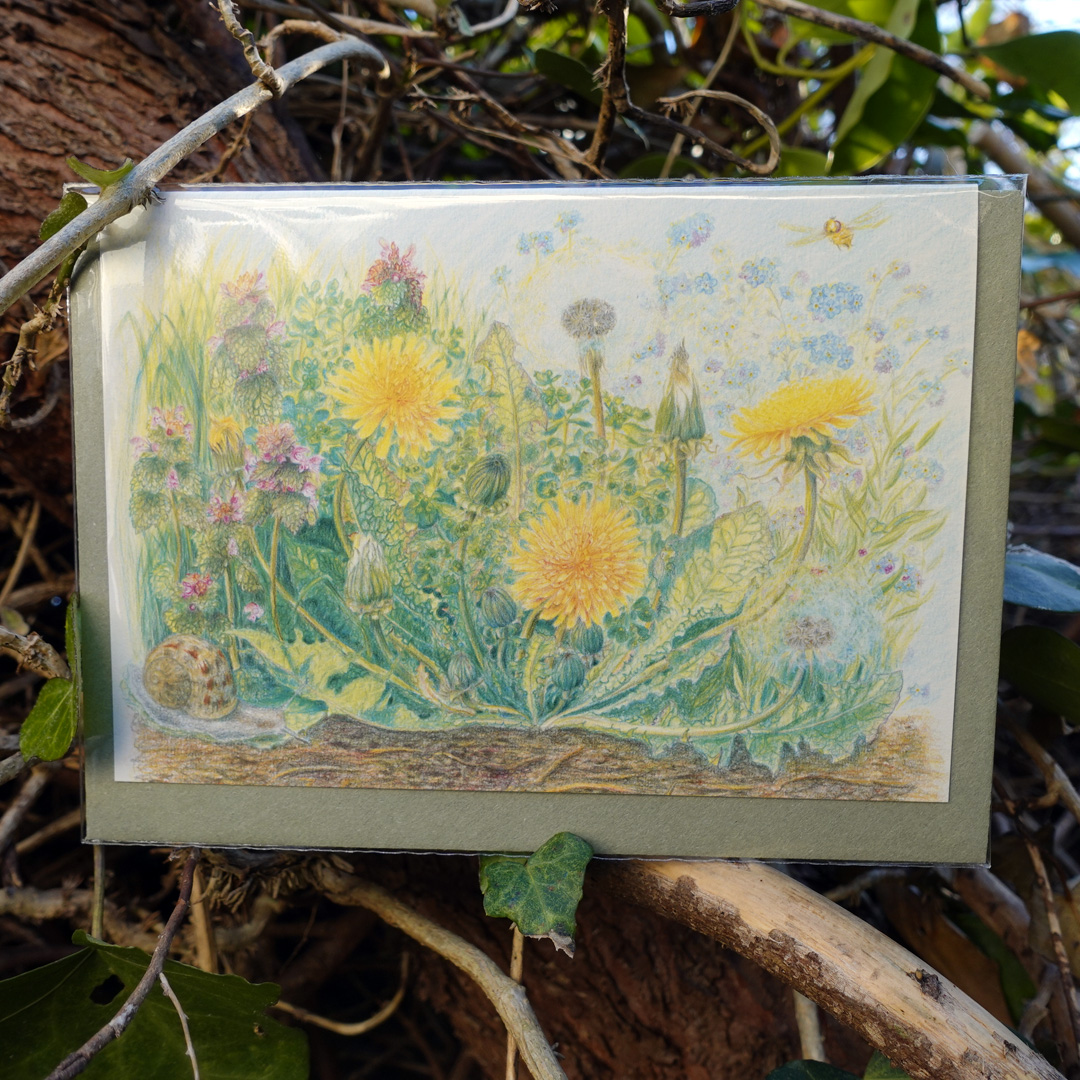 A little photo of my greetings card Dandelions. Dandelions are one of the earliest wildflowers and are very important sources of nectar for insects. Their leaves provide some kinds of caterpillars with food too. They're also just so cheerful and bright. I've drawn them here with red deadnettles and sun spurge, and a cloud of forget-me-nots. A common garden snail with rich red-brown patterns on its shell is browsing a leaf and above the forget-me-nots is a hoverfly, its wings a blur.