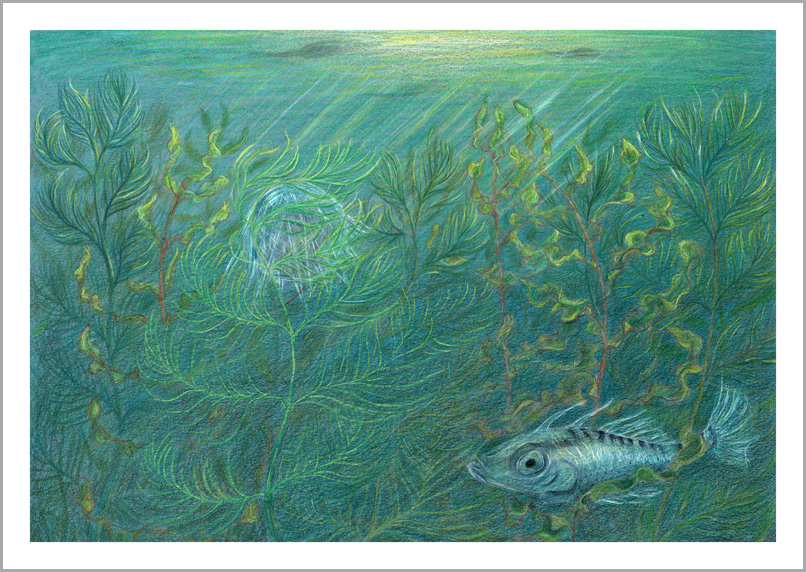 Marsh Fritillary and Devil's Bit Scabious. The Marsh Fritillary is the only insect in Ireland which is legally protected. This beautiful butterfly lays its tiny yellow eggs on the foliage of the Devil's Bit Scabious, which is so named because its root was supposed to have been bitten off by the devil.The Diving-Bell Spider creates a bubble for itself underwater, where it can sit breathing air and watching potential prey swim by. The bubbles are very beautiful, as is the spider itself - often a rich reddish brown with a velvety abdomen. I've always found the idea of them mysterious and romantic. Their genus name Argyroneta translates as 'spinner of silver'.The moon over Carlingford Lough.