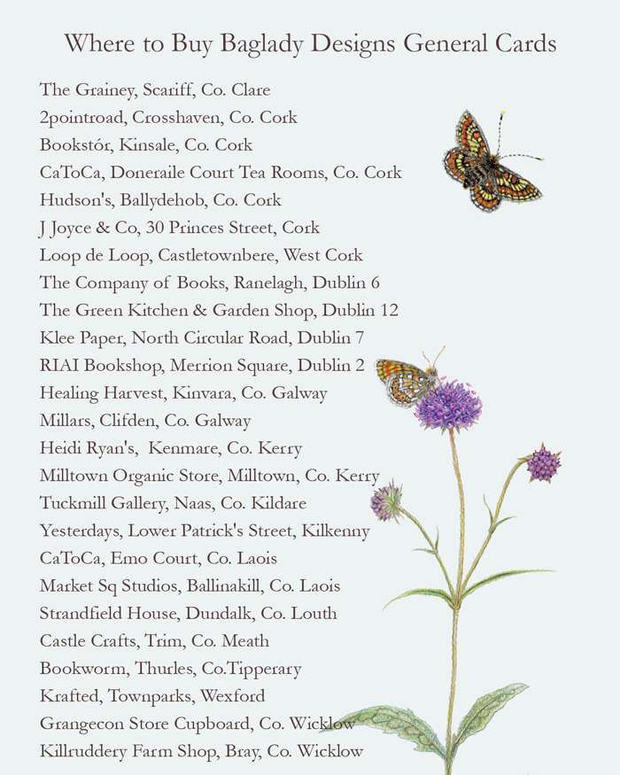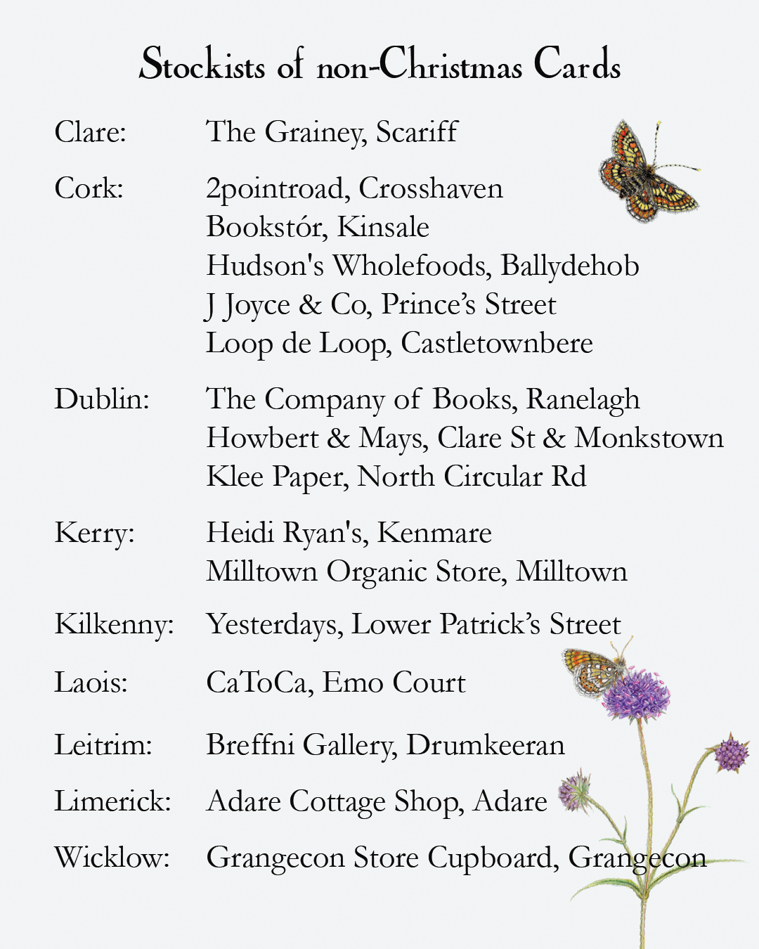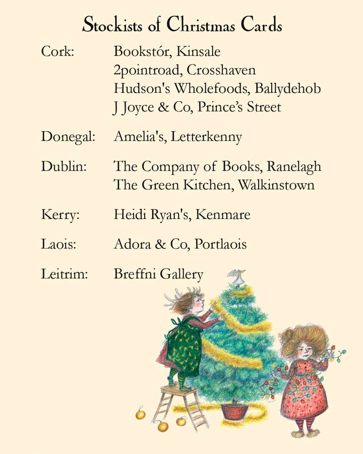 As of the first week in December, you can buy them from Bookstór, Kinsale, Cork; 2pointroad, Crosshaven, Cork; Hudson's Wholefoods, Ballydehob, Cork; J Joyce & Co, Prince's Street, Cork; Amelia's, Letterkenny, Donegal; The Company of Books, Ranelagh, Dublin; Heidi Ryan's, Kenmare, Kerry; Adora & Co, Portlaois, Laois, and the Breffni Gallery, Leitrim
