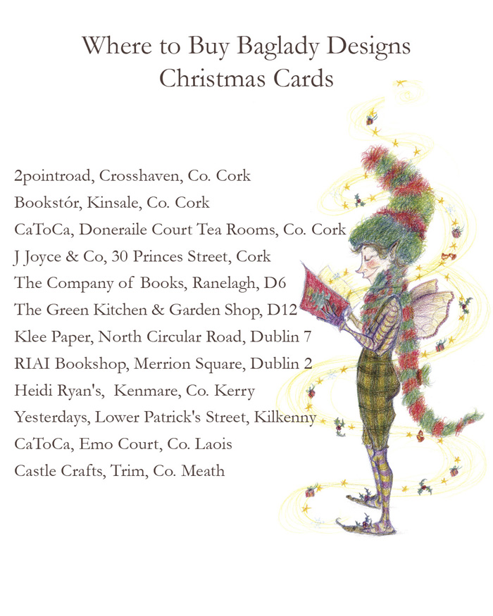 December's here and Baglady Designs Christmas cards are in a number of independent shops around Ireland. Printed on recycled paper and packaged in biodegradable cellophane, these beautifully illustrated cards make Christmas greetings extra special.