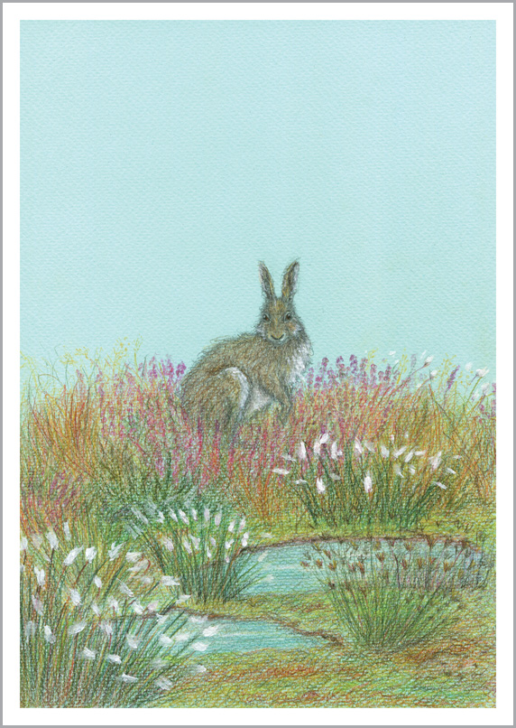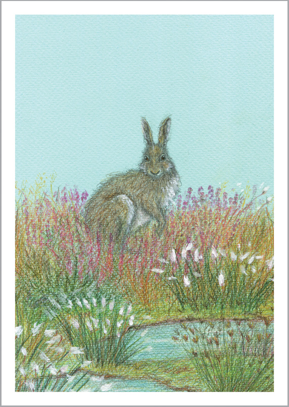 An Irish hare among heather, bog-cotton and toad rushes.A frog leaps over some sphagnum moss. Sphagnum is the building material of bogs. As new moss grows on top of old, the moss beneath slowly transforms into peat. Sphagnum grows bog at a rate of one millimetre depth a year. Peat only a metre deep was formed around the time of the Vikings.