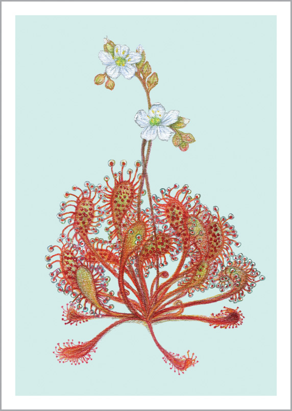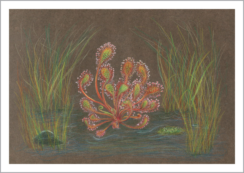 Sundews. These beautiful plants live on bogs. They are carnivorous and feast on unwary insects. The sweet, sticky droplets that lure and trap their prey also catch the sunlight, and often makes their scarlet tipped leaves glitter like rubies.Bog asphodel, cross-leaved heath, and a Large Heath butterfly.The brown female hen harrier flies with her blue-grey mate over moorland.
